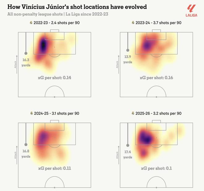 维尼修斯保持边路宽度,也意味着他不再像上赛季在安切洛蒂手下那样,能在禁区内接应传中或在中路反越位前插。这一点在他的射门分布上体现得十分明显。