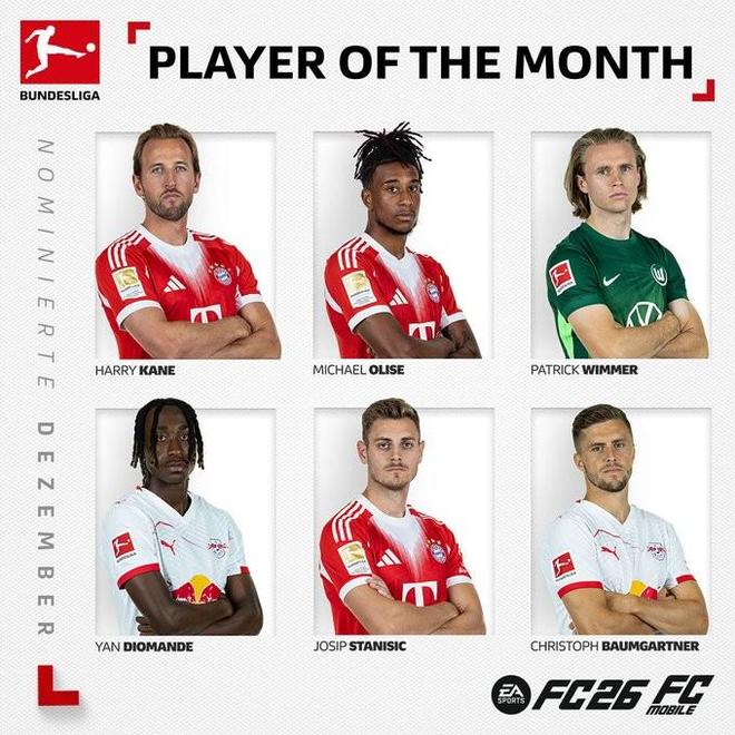 北京时间12月31日,德甲12月最佳球员候选名单公布,这6名球员为凯恩、奥利塞、维默尔、迪奥曼德、斯塔尼西奇、鲍姆加特纳。